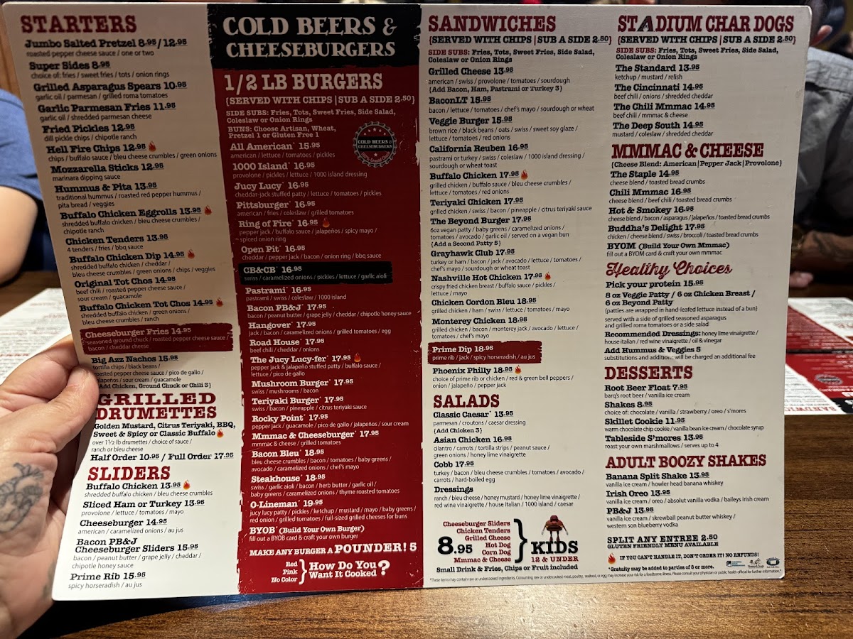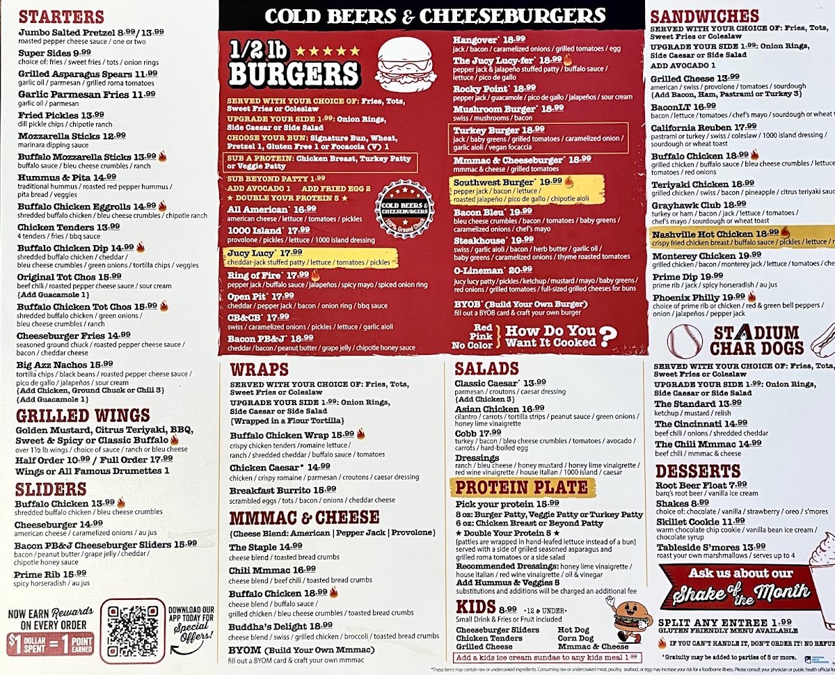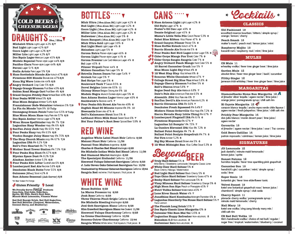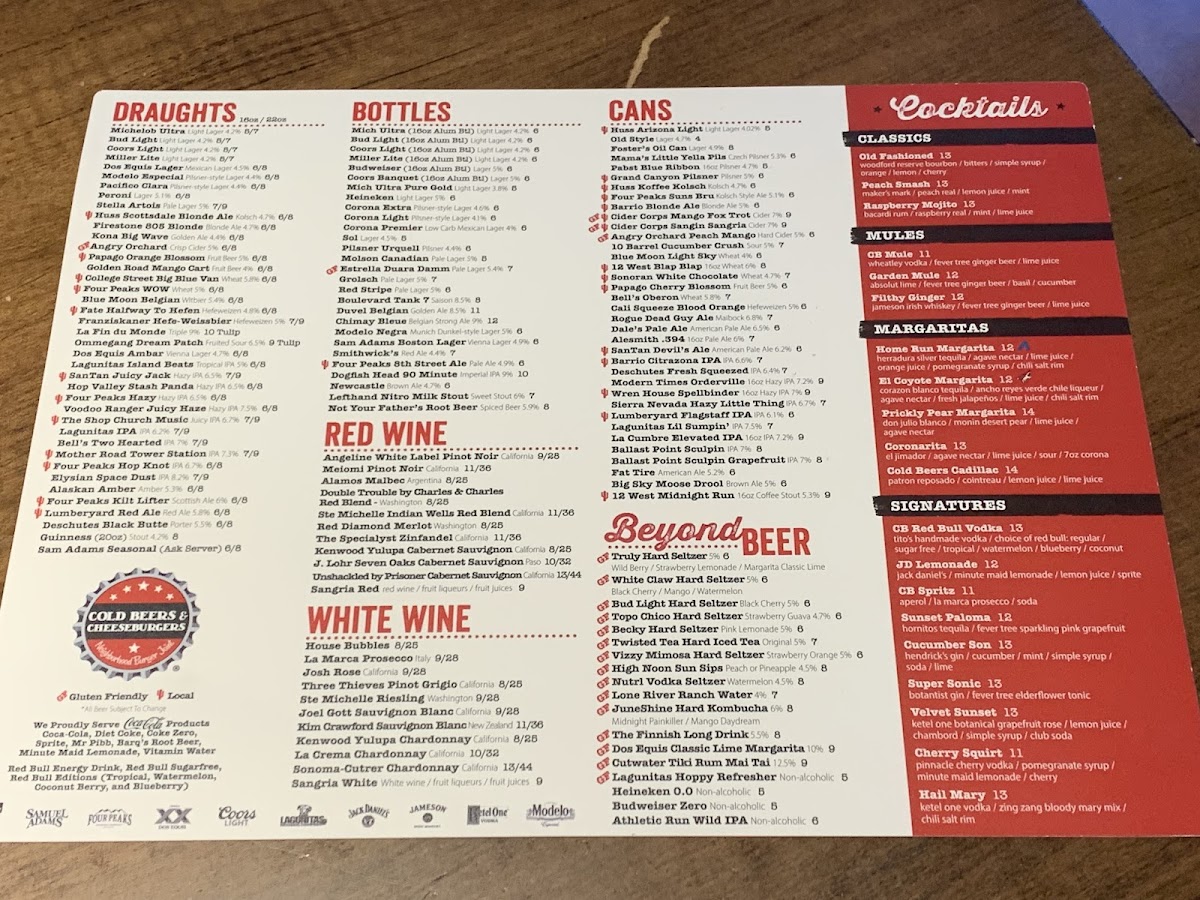 Cold Beers & Cheeseburgers in Chandler, AZ, is a vibrant spot where casual dining meets lively sports bar energy. The menu shines with juicy, expertly crafted burgers that have won loyal fans, like the fiery Ring Of Fire, beloved for its bold yet balanced kick. Beyond burgers, their grilled wings come in various flavorful styles—from classic Buffalo to tangy Citrus Teriyaki—each served with ranch or bleu cheese for dipping. Starters like the Buffalo Chicken TotChos and Jumbo Salted Pretzels pair perfectly with cold brews, making them ideal for sharing. Fresh salads, including a hearty Cobb and an Asian Chicken Salad with peanut sauce, offer lighter options but still deliver rich flavors. The friendly service and numerous TVs create a welcoming atmosphere that appeals to both families and sports fans. Whether craving a solid burger or a spirited night out, Cold Beers & Cheeseburgers provides an authentic bar & grill experience with a satisfying variety of hearty dishes.